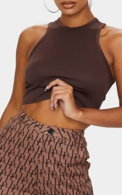 Doll this top is the perfect addition to your s collection. Featuring a chocolate jersey material with a racerback design and a cropped length. Style with some brown pants, statement hoops and mules for a look we are loving.
