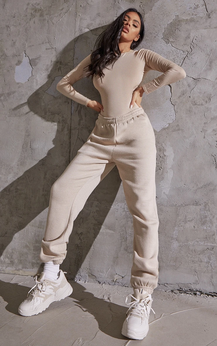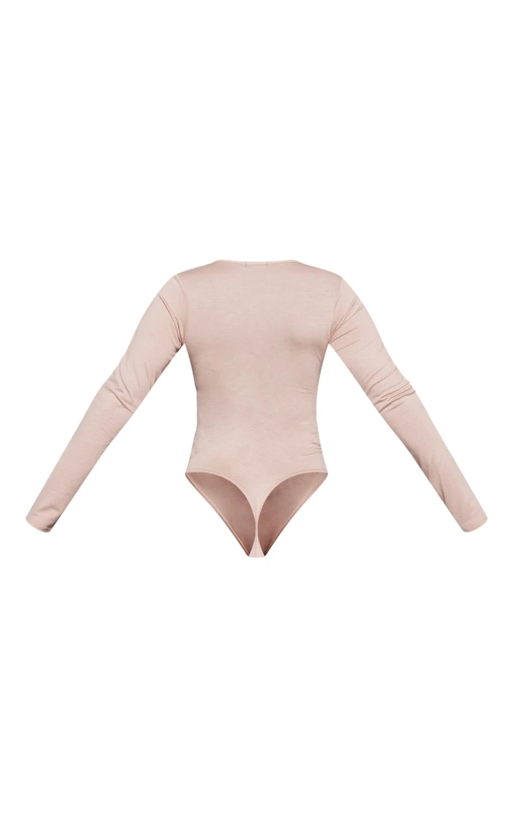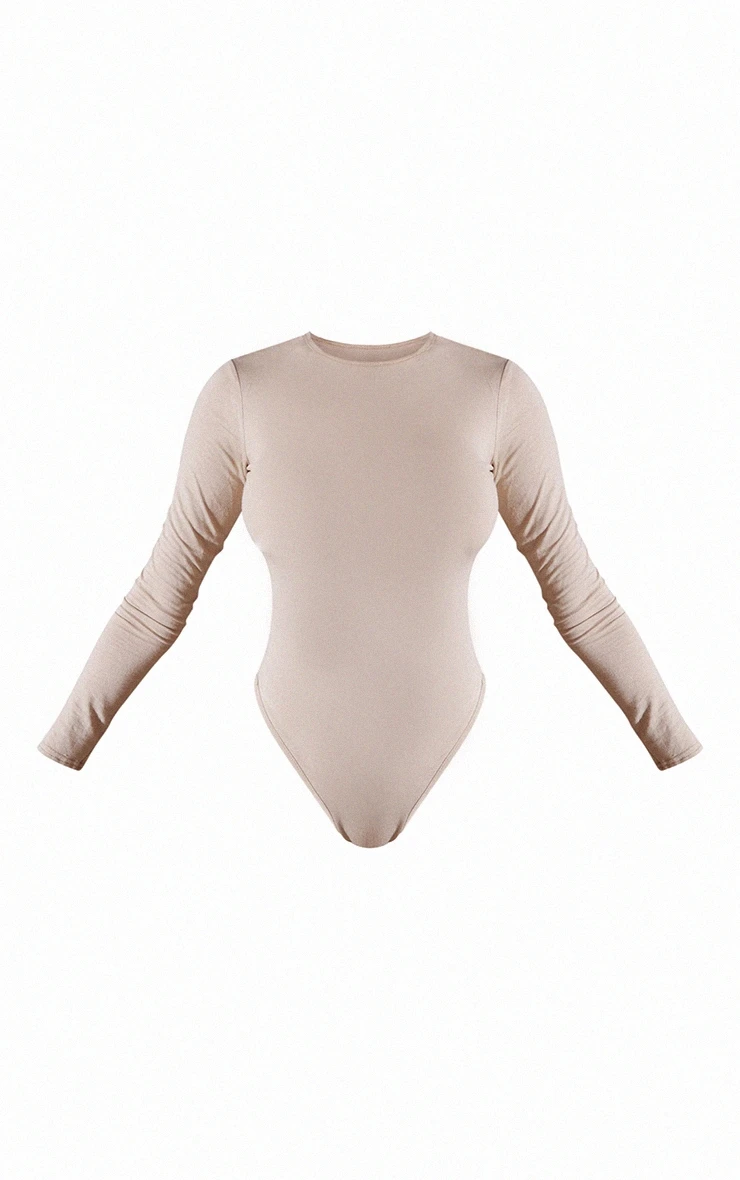 Keep it simple and chic in neutrals this season with this bodysuit. Featuring a simple stone jersey fabric, a crew neckline with long sleeves and popper fastenings. The simple style can be dressed up or grunged down with comfy bottoms and kicks.