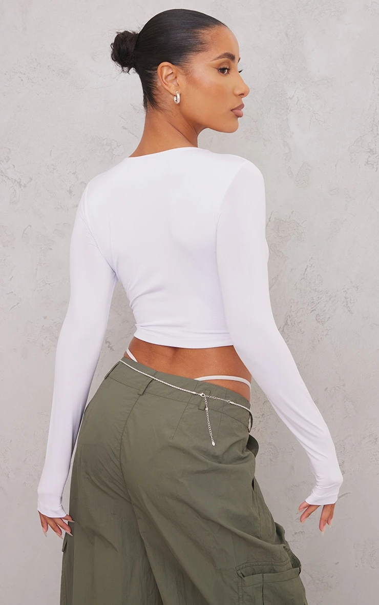 We are loving this top for dressing up or dressing down. Featuring a recycled white slinky material with long sleeves and a cropped length, how could you say no? Wear with cargo bottoms and barely-there heels for a brunch date with the dolls.