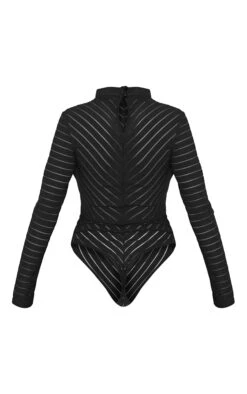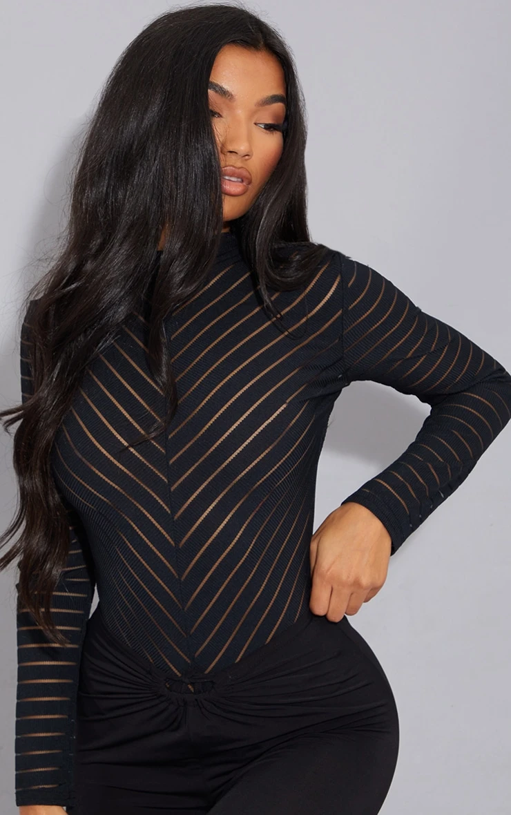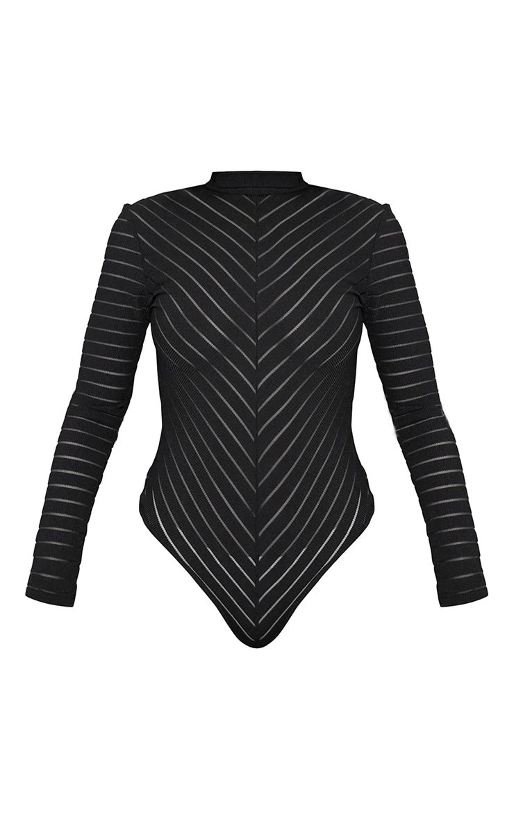 Give your look an edge with this black mesh bodysuit doll for a fit you will want to wear again and again. Featuring a black chevron mesh material, a high neckline and a thong fit, what’s not to love? A long sleeve bodysuit is perfect for dressing up or down wherever you’re heading and we are obsessed with this versatile style. Get one in every colour! Team it with some black trousers and strappy heels for a simple but chic look.