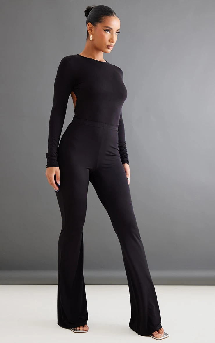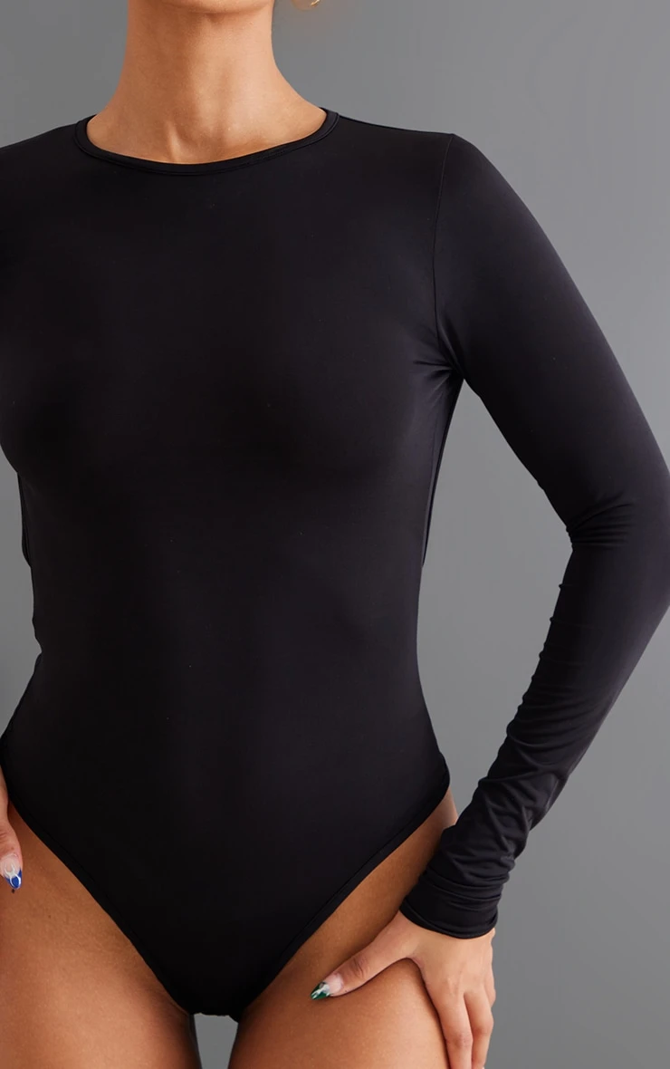 Add a little edge to your weekend wardrobe with this black slinky open back long sleeve bodysuit. This bodysuit will be sure to make a statement at your next event. With a black hue and a slinky material, this bodysuit will have you tapping into your confident side. This bodysuit features an open back design, we are obsessed. Team with some black flares, gold hoops and a pair of your go-to heels to finish off this effortlessly chic look.