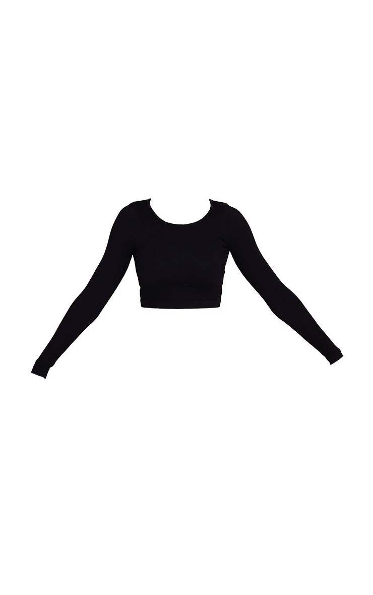This top is sure to be your new season go-to. Featuring a black structured contour ribbed material with a round neck design, long sleeves and a cropped fit. Team this with comfy bottoms and chunky boots for a chic off-duty fit.