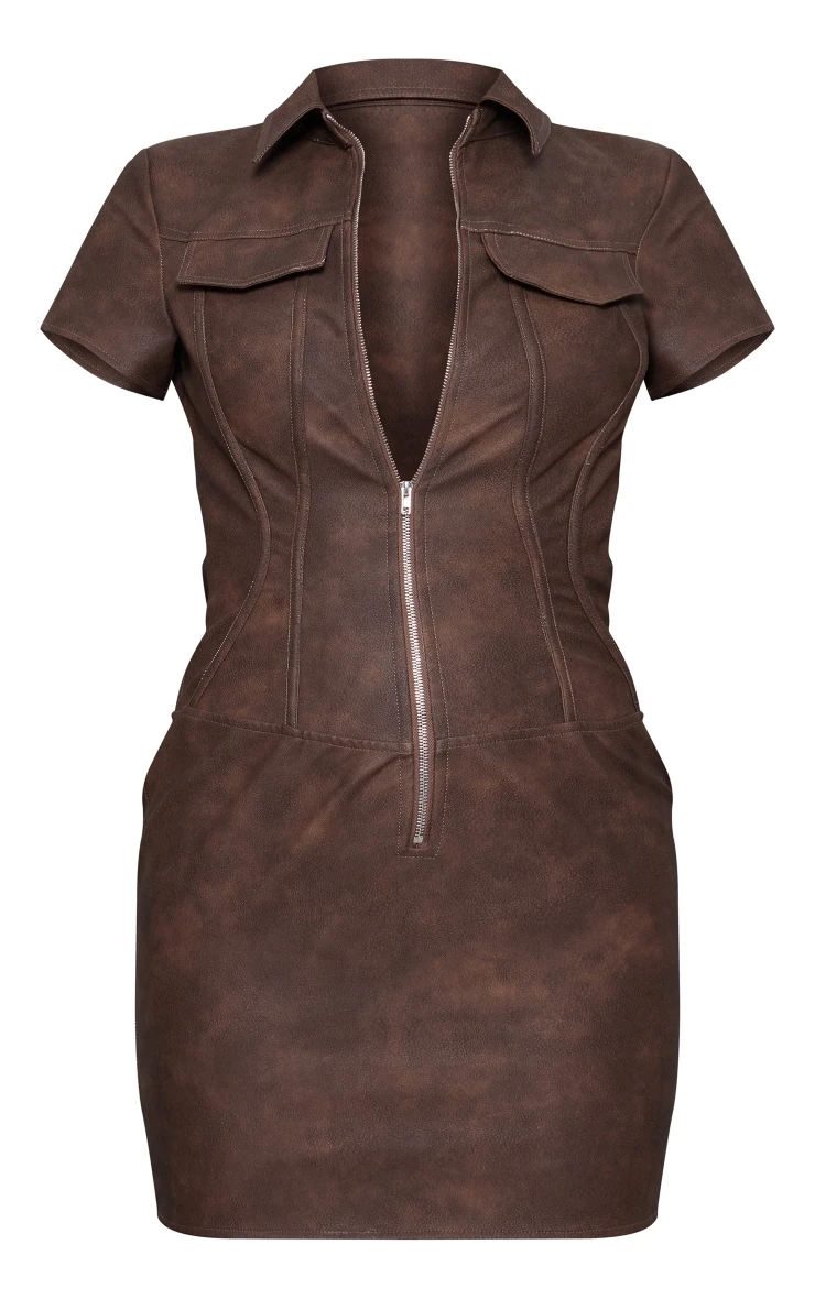 Get ready to have all eyes on you in this brown faux leather binding detail zip through bodycon dress. Made from a chic brown faux leather material and in a figure-flattering bodycon fit, this zip through dress is sure to be your new weekend fave. Simply style with some on-trend western style boots and statement accessories for a look that will have you earning some serious style points all season long.