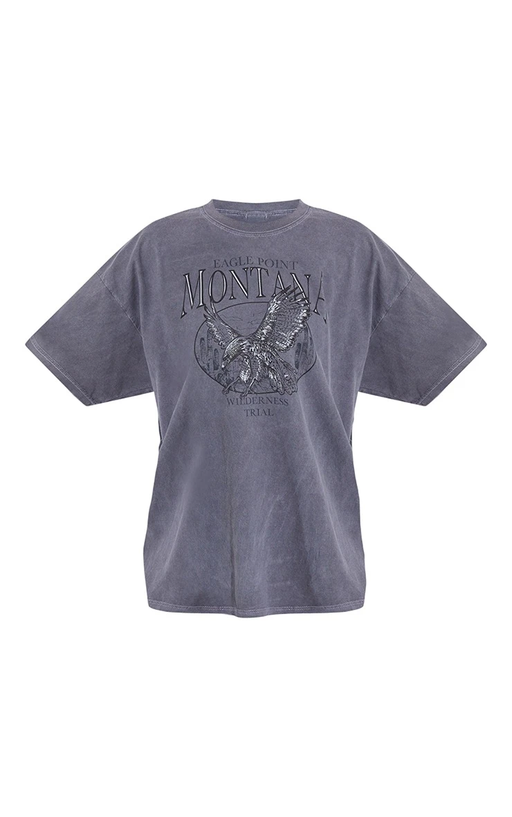 Channel your inner grunge in this oversized t shirt doll. Featuring a charcoal material with a Montana logo, in an oversized fit. Style with black joggers and chunky boots for an off-duty look we are totally vibin’ with.