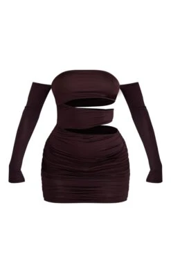 Got some last minute plans doll? This bodycon dress is perfect for the occasion. Featuring a chocolate slinky material with multi cut out details and a bardot neckline with sleeves. Style with heeled boots and your fave accessories.