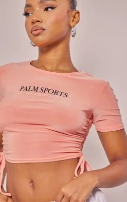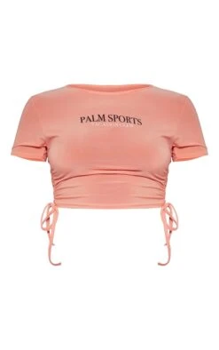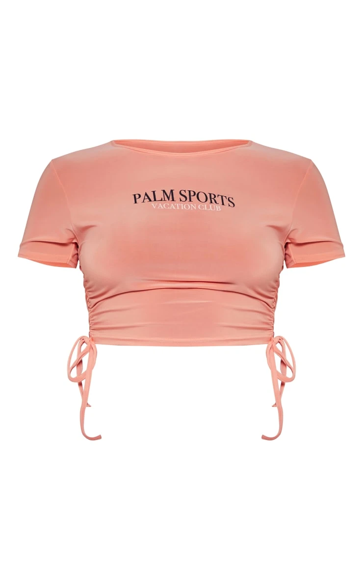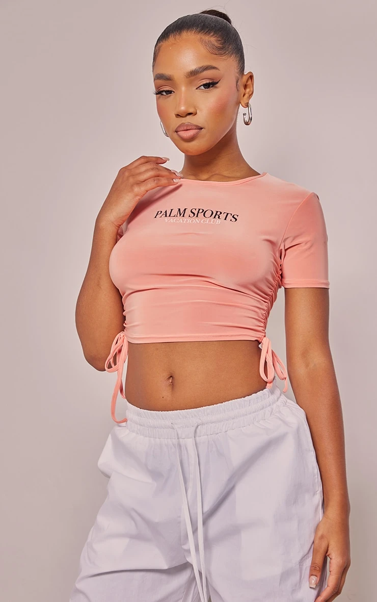 Make them stop and stare in this coral palm sports ruched side t shirt. This t shirt is brought to you in a coral material with a ‘Palm Sports’ design across the front for a little added edge, what’s not to love? With a ruched side for a flattering fit, we are obsessed. Team with some wide leg trousers and a pair of gold accessories to finish off the look everyone is loving.