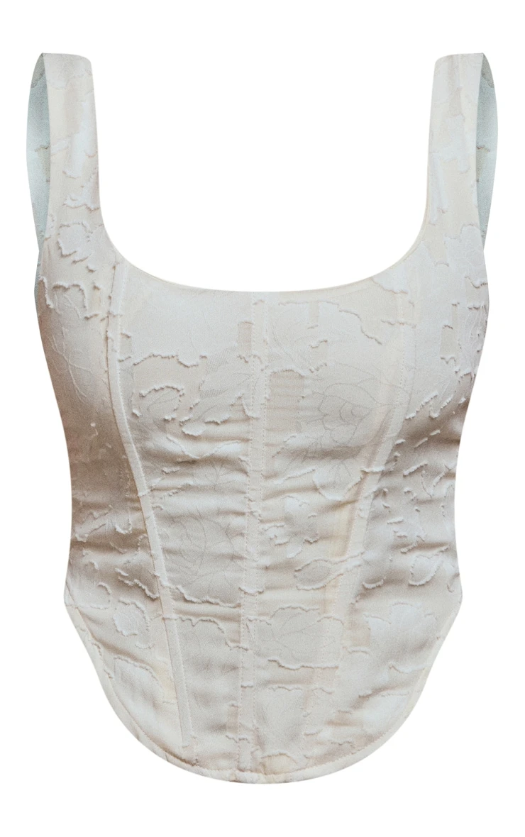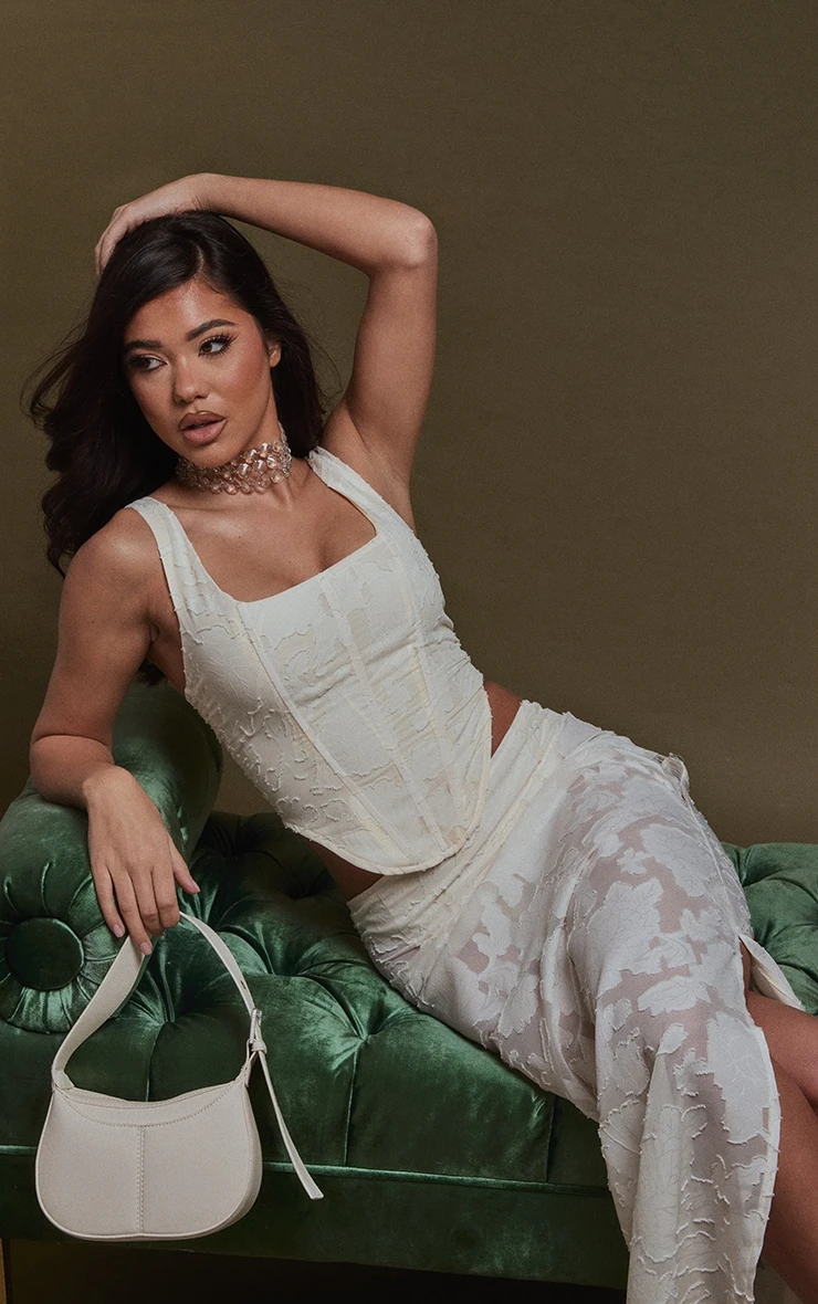 Take your weekend ‘fit to new heights with this cream floral applique dip hem corset top and gain all the likes with this insta-worthy look. Its cream hue material gives you the dreamiest vibe whilst its floral applique details adds a fiercely feminine touch. This corset top has the perfect structure to give you the figure-flattering fit you need. Pair with the matching skirt and gold accessories for an extra glam finish.