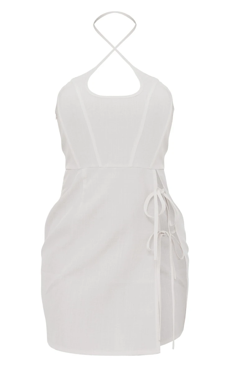Make them stop and stare in this cream linen look haterneck tie detail corset bodycon dress. Made from a cream hue linen look material with a halterneck design, tie detailing and a flattering corset fit that is sure to worship your shape, what more could you want? Just add your highest heels and statement accessories for a seriously chic weekend look that perfect for your next occasion doll.
