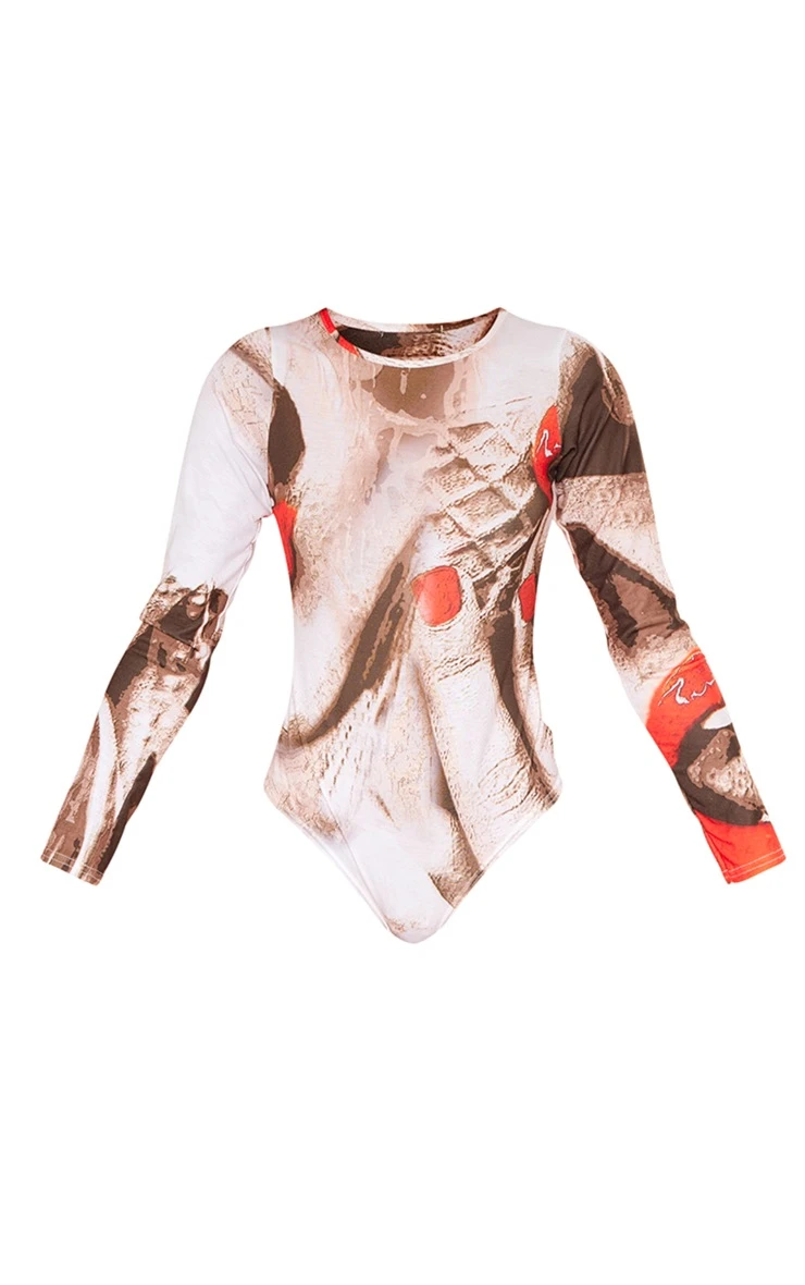 Give your wardrobe a fresh update with this cream print basic crew neck long sleeve bodysuit. Its cream print material is sure to steal all the stares whilst its crew neck and long sleeves is super flattering. This bodysuit is the ultimate styling piece this season and will take any look from AM to PM. Team with tailored trousers, platform sandals and gold accessories for a weekend-worthy finish.