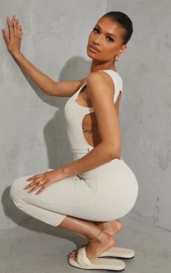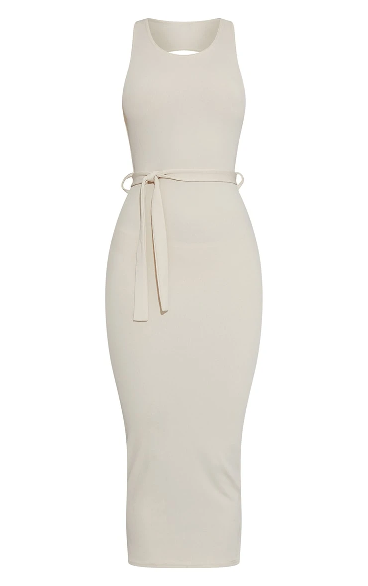 Get Summer ready now with this midaxi dress. Featuring a cream ribbed material with a cut out back design and a tie waist detail, team this dress with on trend slides for a look we’re loving.