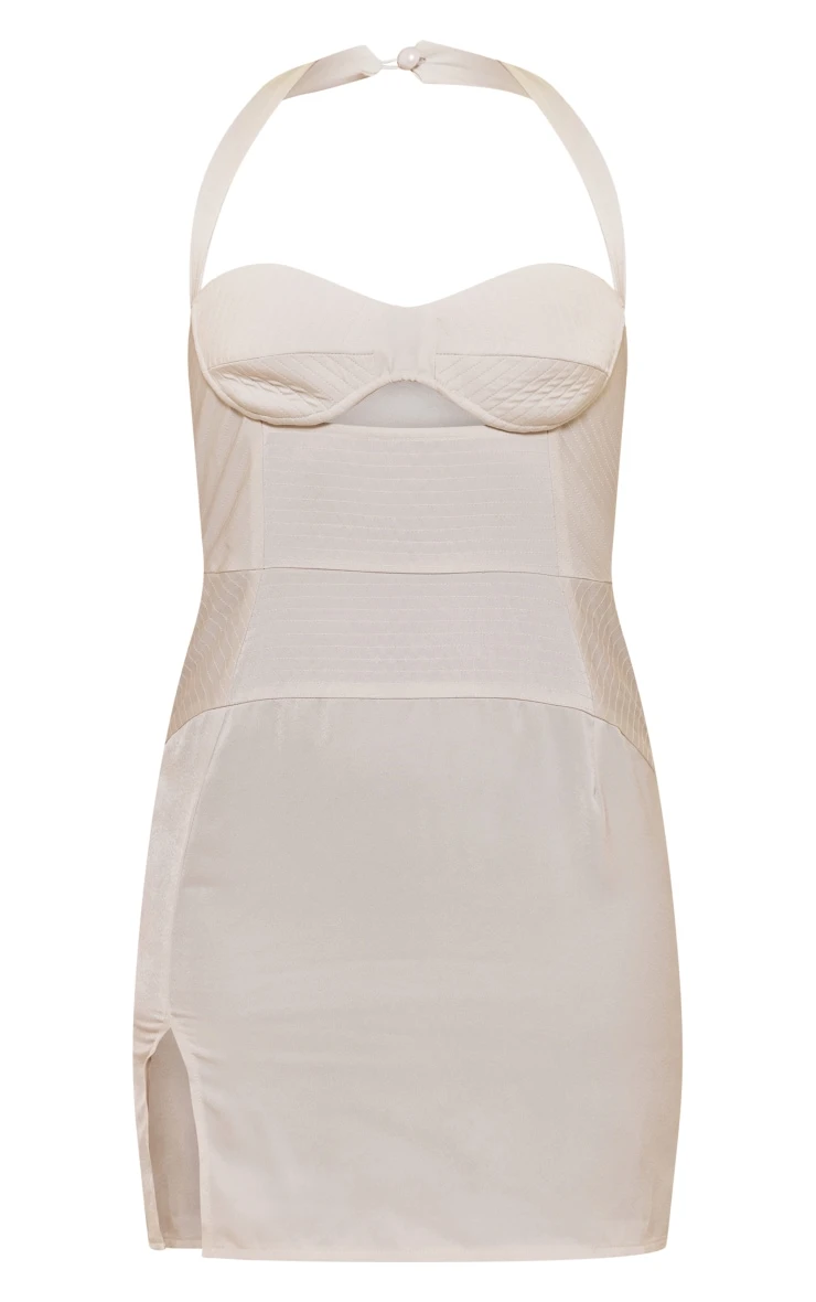 Get maxing out your wardrobe with this cream satin textured cup detail halter bodycon dress. This dress is brought to you in a cream satin material that will have you feeling all kinds of luxe. With a cup detail and a halter design, this bodycon dress will have all eyes on you. Team with some clear heels and your fave accessories to take the look to new heights.