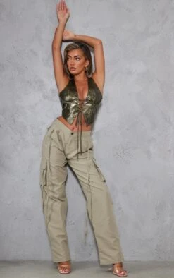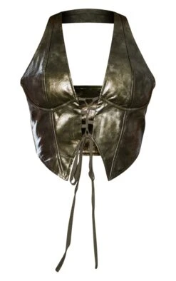 Dare to stand out from the crowd in this unreal top. Featuring a dark green washed faux leather material with a lace-up front design and a halterneck fit, how dreamy? Style with cargo bottoms and clear heels for a look we can’t get enough of.