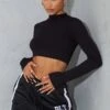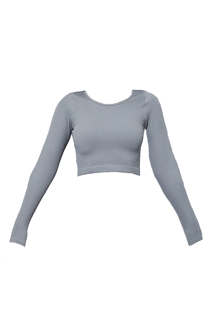 Complete your casual look with this crop top. Featuring a dark grey rib material with long sleeves, a round neckline and a structured fit. Style these with the matching leggings and slides for a combo we are loving.