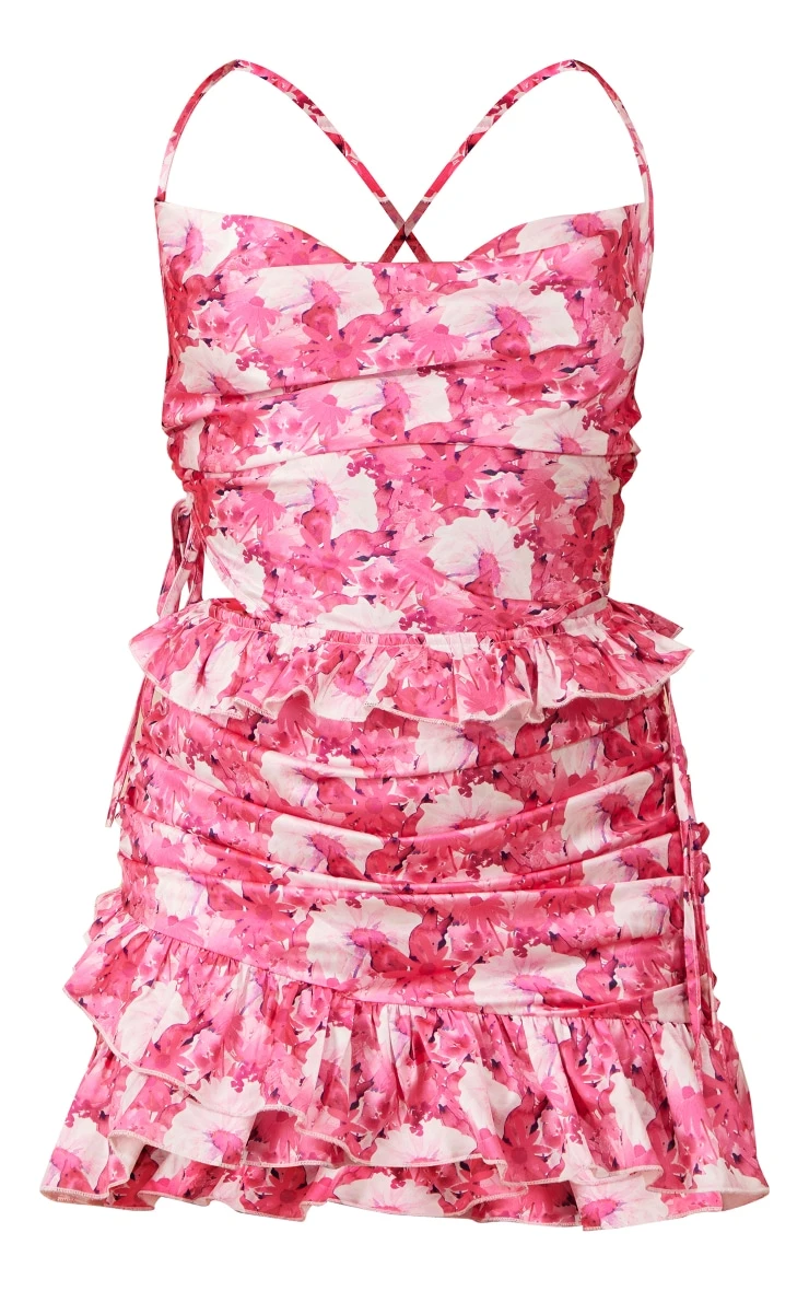Hot Pink Floral Abstract Print Ruched Frill Detail Strappy Bodycon Dress