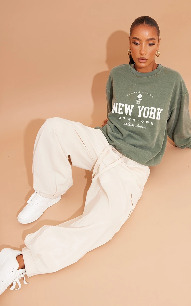 This piece is sure to be your new go-to for off-duty styling doll. Featuring a khaki material with a ‘New York Downtown’ slogan print and a comfy fit, we are obsessed. Just add some simple accessories and a slides for a look that will steal all the stares.