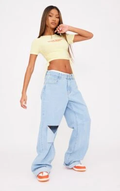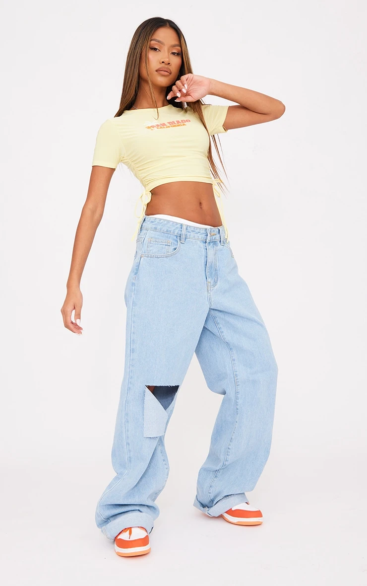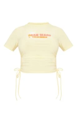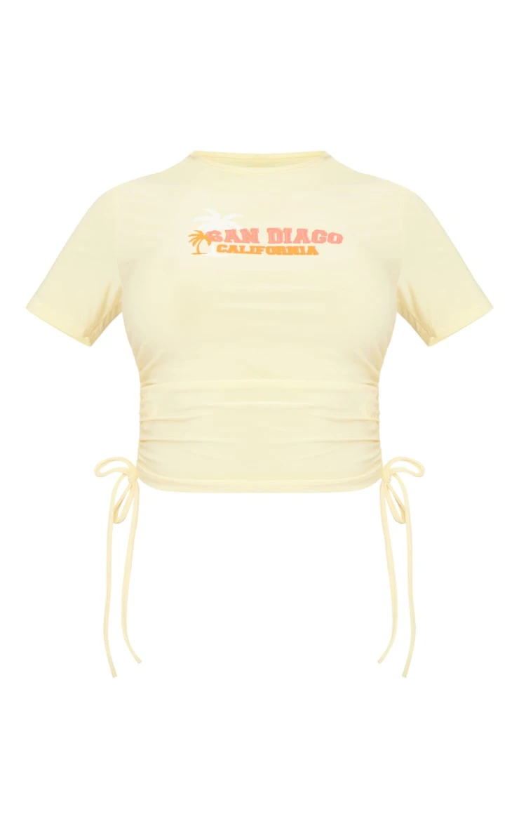 Add some drama into your weekend wardrobe with this lemon San Diego ruched side t shirt. Brought to you in a lemon material with a ‘San Diego’ print across the front, we are seriously obsessed. With a ruched side, you’re sure to have all eyes on you. To complete the look style with some wide leg blue jeans and a pair of trainers for an insta-worthy you won’t be able to resist.