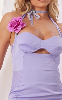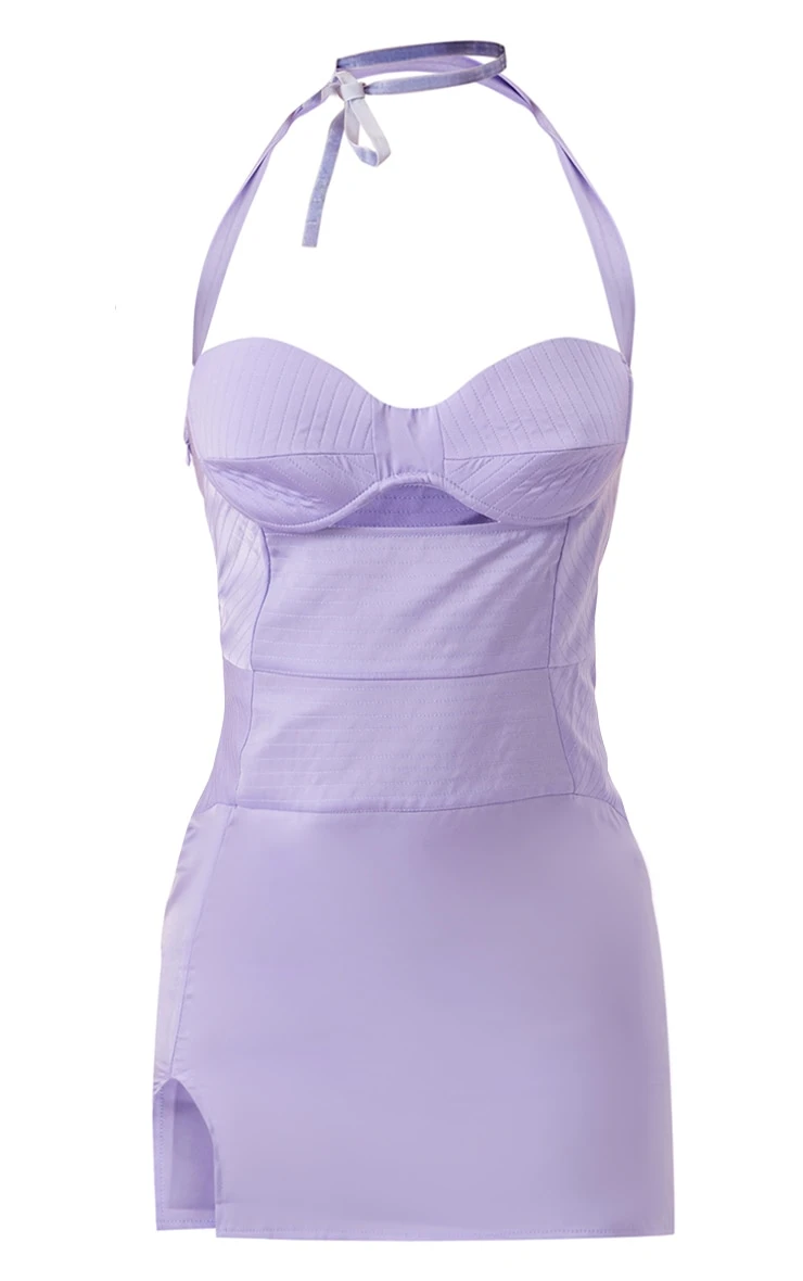 Add some dreamy hues into your weekend wardrobe with this lilac satin textured cup detail halter bodycon dress. Made from a lilac satin material with cup detailing, a halterneck design and a figure-hugging fit, how could you say no? This figure-hugging dress is everything you need to ensure all eyes are on you. Pair with lilac high heels and mini bag for a look that we can’t stop crushing on.