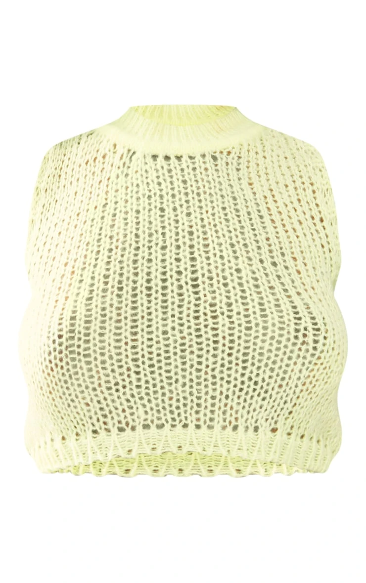 Brighten up your wardrobe for the new season with this lime green open knit sleeveless crop top doll. This crop top features a lime green open-knit material, a sleeveless design and cropped length, how could you say no? Whatever your plans are this crop top is perfect styling for both the weekend and everyday plans. For a fresh new vibe, pair with shorts, platform sandals and your fave accessories.