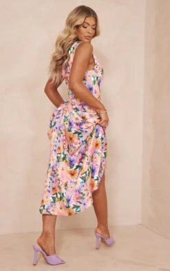 Multi Floral Print Satin Off The Shoulder Draped Skirt Midi Dress