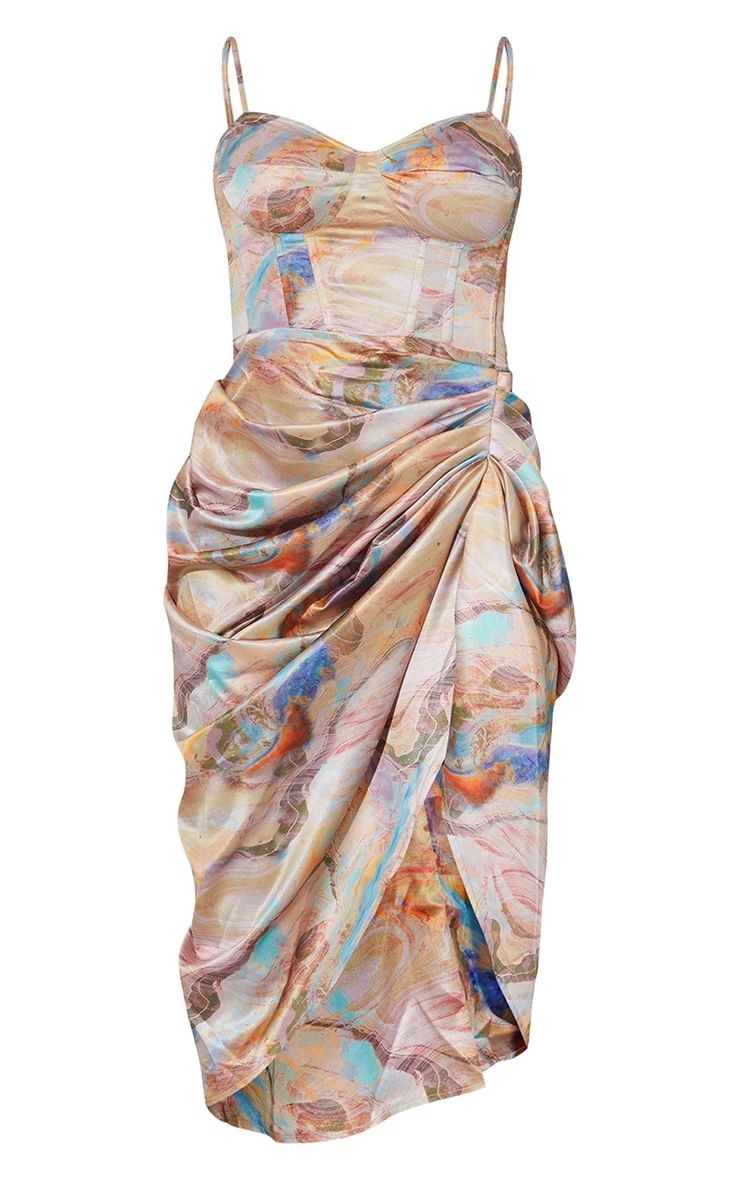 Multi Marble Print Satin Ruched Skirt Corset Detail Midi Dress