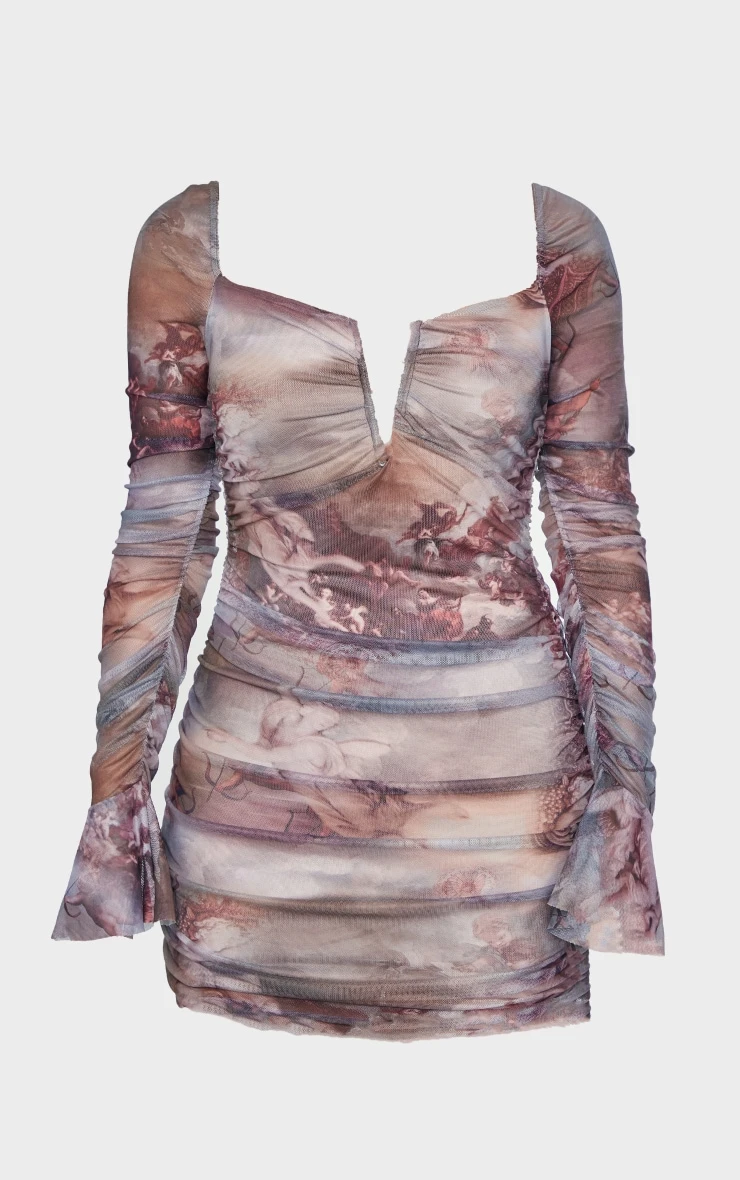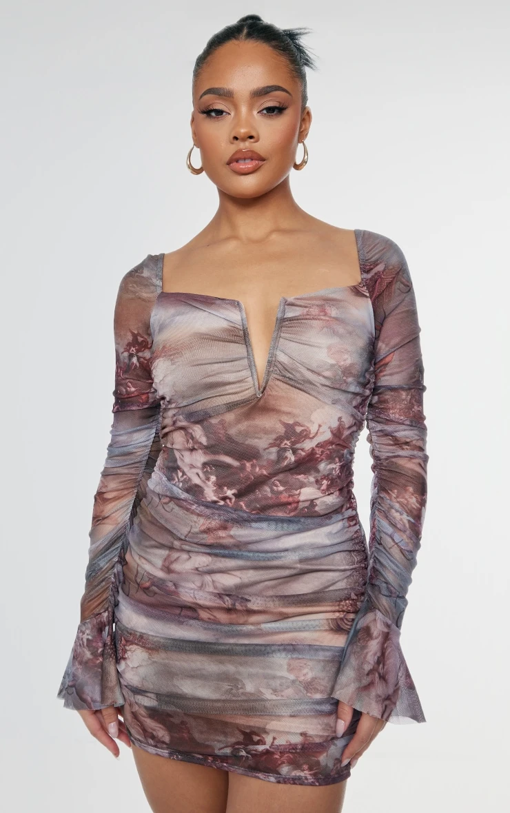 Take your weekend look to a whole new dimension with this multi renaissance print mesh v bar ruched bodycon dress. Brought to you in a multi renaissance mesh print material with a V bar desin, ruched detailing and a figure-hugging fit, how could you resist? This women’s bodycon dress is here to serve you nothing but heat. So, what are you waiting for? Pair this with your dreamy high heels and accessories for a glam finsih.