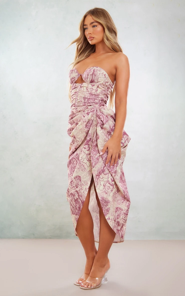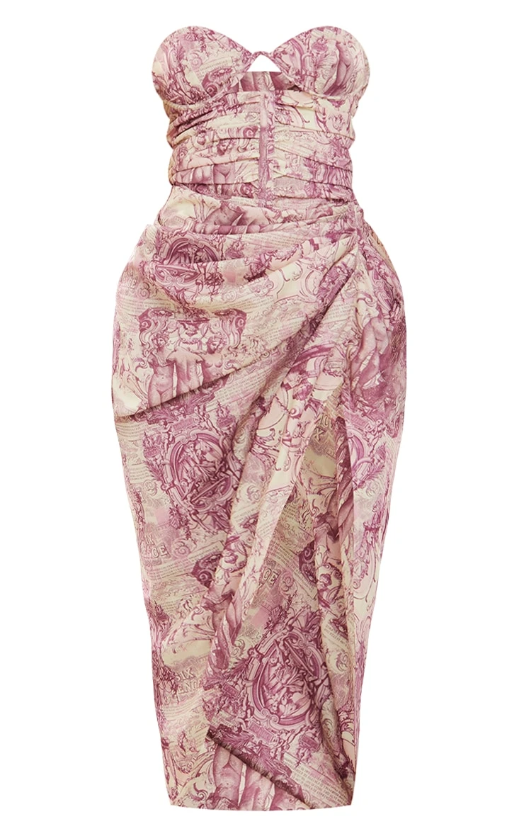 Multi Renaissance Print Underwired Ruched Drape Midi Dress