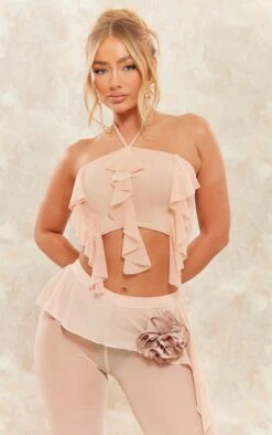 The weekend is here doll and this natural stone mesh halterneck frill crop top is the answer to all your what-to-wear dilemmas. With a natural stone mesh material, a halter neckline, and frill detail, how could you resist? This crop top is sure to gain all the compliments this weekend. Simply pair this crop top with matching hue trousers, clear heels and gold accessories for a statement finish.