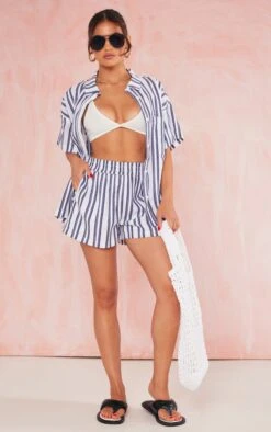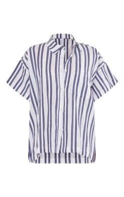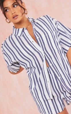 The new season is calling doll and you need to answer with this navy textured linen look stripe oversized boxy shirt. Its navy striped textured linen look material adds all the fresh feels whilst its oversized boxy fit is perfect for the summer. This shirt has endless styling possibilities, whether you wear it down to the beach or for your everyday look. Shop the look and add the matching shorts, a bralette and shades for a dreamy look that everyone will love.