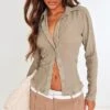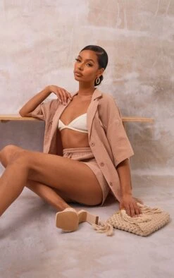 Switch up your look this season with this shirt. Featuring a nude woven material with shorts sleeves, pocket detailing and an oversized fit, what’s not to love? Wear with the matching floaty shorts, simple accessories and heeled mules for a date with the dolls.