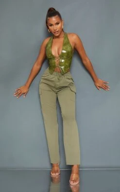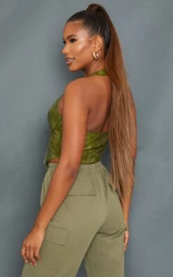 Got plans for the weekend doll? Then this top is a must. Featuring an olive washed faux leather material with a lace-up front design and a halterneck fit. Pair this with matching hue bottoms and heels for a look we’re obsessing over.