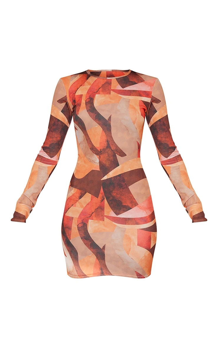 Update your weekend wardrobe with this bold dress. Featuring an orange abstract print ribbed material with long sleeves and a bodycon fit. Simply complete the look with gold accessories and heeled mules.