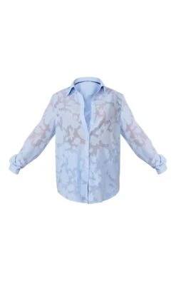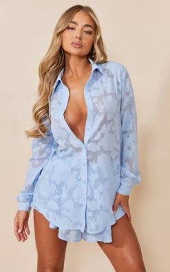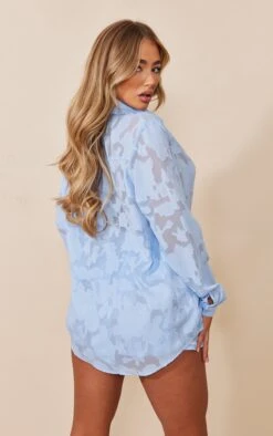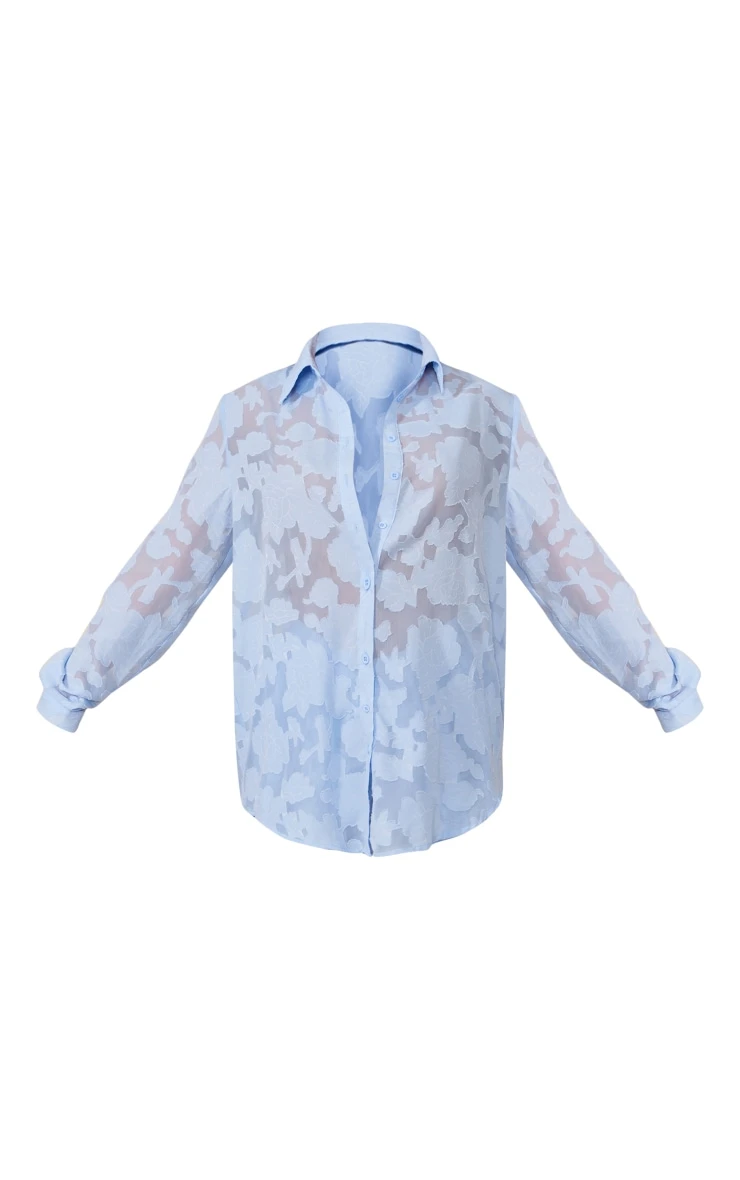 Freshen up your wardrobe with this pale blue sheer floral textured long sleeve oversized shirt. It’s pale blue sheer floral textured material is seriously chic and adds an instant touch of luxe to your look. This shirt has an oversized fit and button-up fastening which makes perfect for styling. We are loving it styled with the matching shorts, strappy heels, and gold accessories for a look that will get everyone talking.