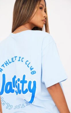 Your off-duty look just got a whole lot better with this PrettyLittleThing baby blue athletic club varsity print t-shirt. This t-shirt is brought to you in a baby blue material with an ‘Athletic Club Varsity’ print for a little added edge. With its oversized fit, what’s not to love? Team with a mini skirt and a blazer to elevate the look even further.