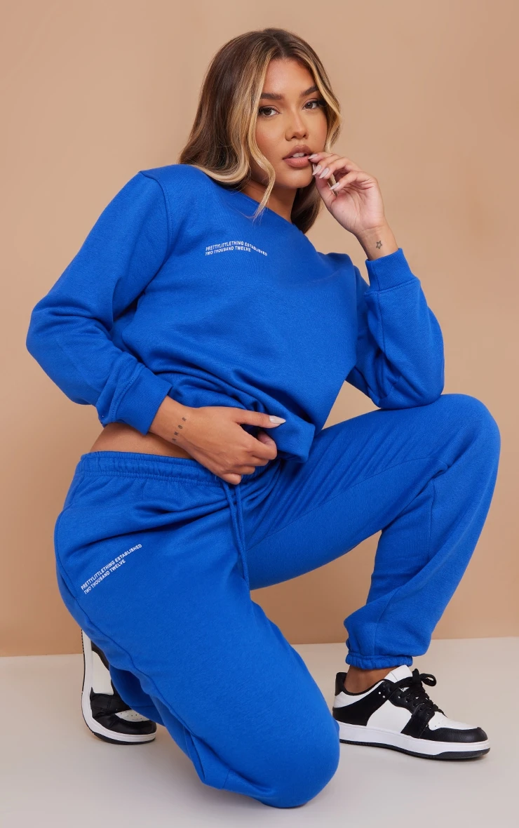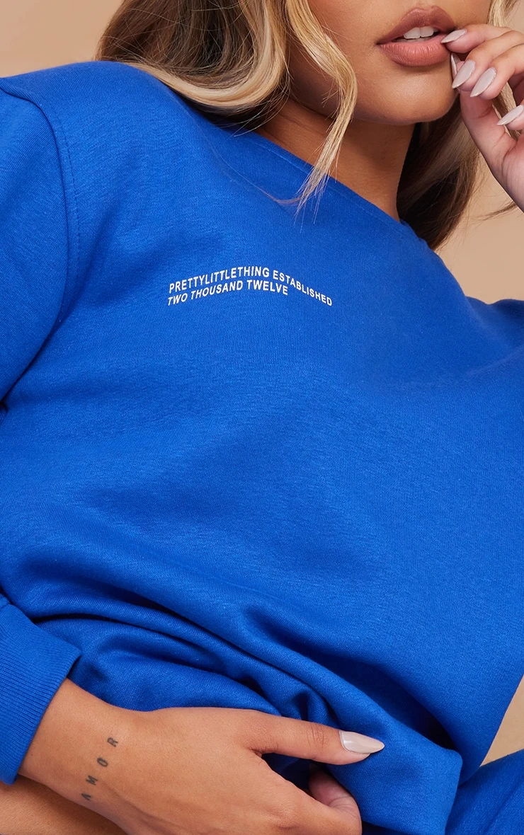 Your chill wardrobe is getting a serious update doll. Featuring a bright blue material with a ‘PrettyLittleThing Est 2012’ print, we are obsessed. To complete your new go-to look pair with the matching bottoms and fresh kicks.
