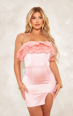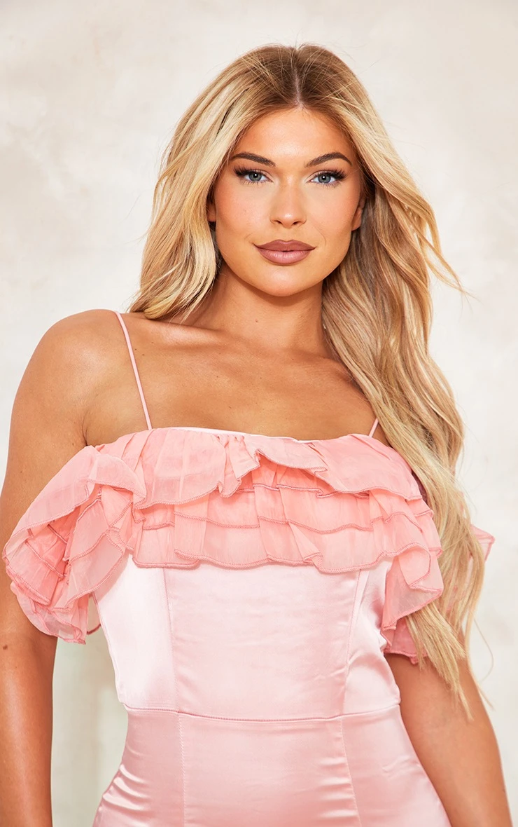 Make them stop and stare in this rose organza frill strappy satin bodycon dress. Brought to you in a dreamy rose hue satin material with a dramatic organza frill design, thin strap and a figure-flattering bodycon ‘fit, how can you not fall in love with this dress? Style with your highest heels, statement accessories and a mini bag for a look that is sure to have heads turning doll.