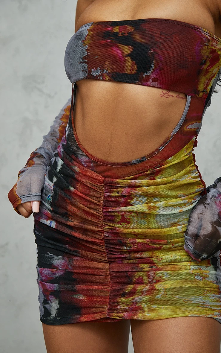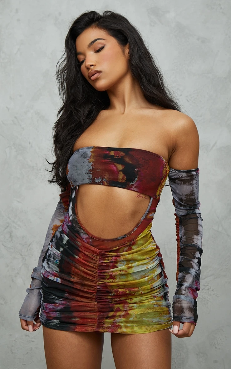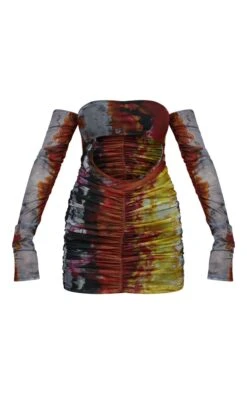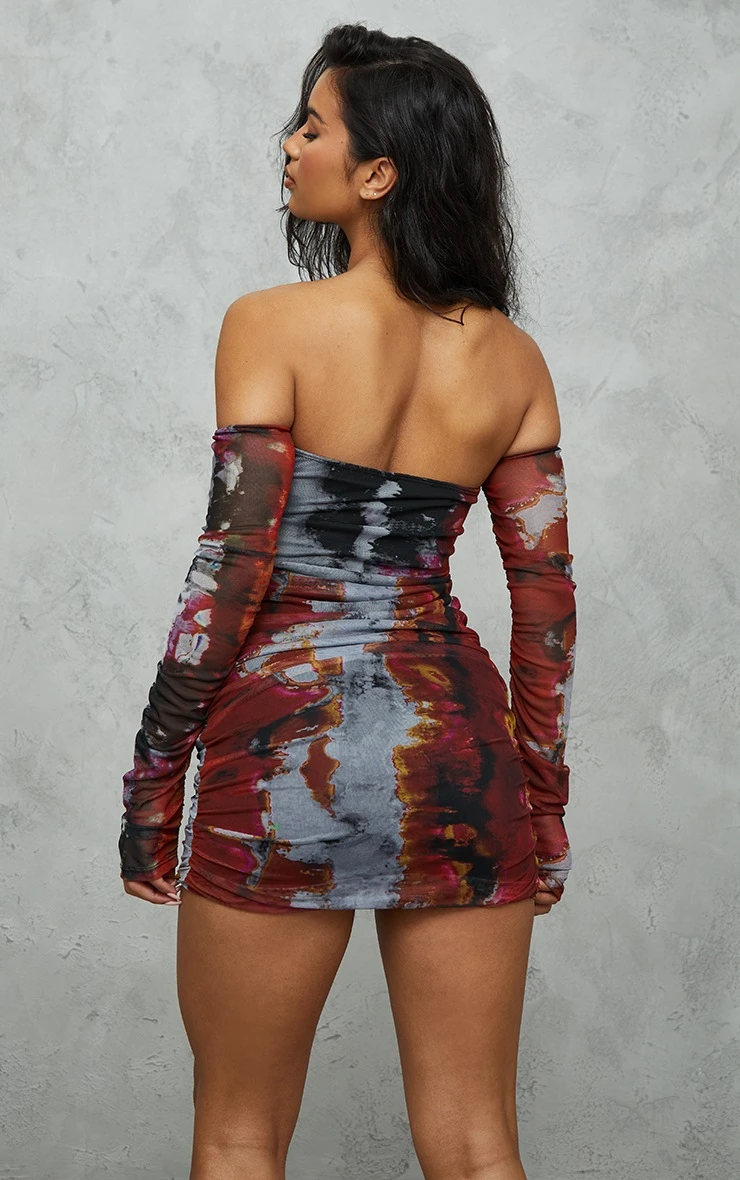 This rust grunge print mesh bardot ruched bodycon dress is sure to add some drama to your new season wardrobe. With a rust hue and a grunge print design for a look that is sure to add some edge to any look. This bodycon dress has a mesh detail and a bardot design for an effortlessly chic look that you wont be able to resist. Style with some black heels and some minimal accessories to take your look to new heights.