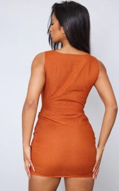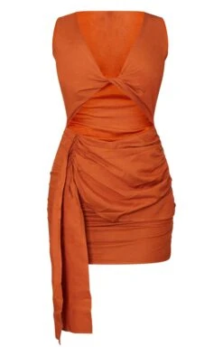 Don’t compromise on your style game this season, this rust linen look twist bust detail drape bodycon dress is a must have. This dress is made from a rust linen look material that is sure to make a statement. With a twist bust detail for a flattering fit and a drape design, this bodycon dress is perfect for those important upcoming occasions.