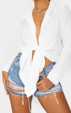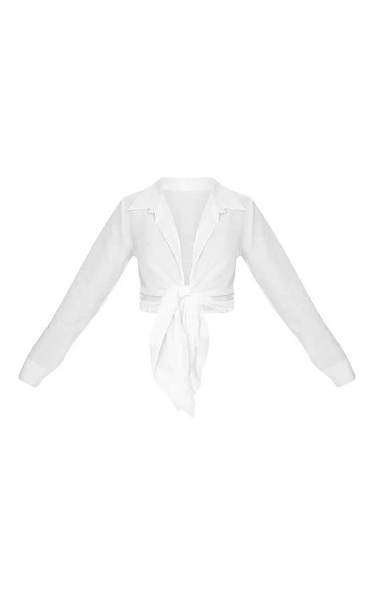 Give your outfit of the day a chic update with this shirt. Featuring a white textured fabric with a tie front detail and long sleeves, team this with light wash denim shorts, gold accessories and mules for a dreamy date night look.