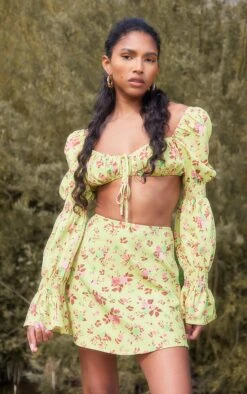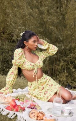 Channel all the summer feels with this yellow floral print woven ruched long sleeve crop top. This women’s crop top is brought to you in a yellow floral woven print material with ruched detailing, long sleeves and a cropped length, how could you say no? This crop top is here to answer any of your styling dilemmas doll. Pair with the matching mini skirt, sandals and accessories for the ultimate combo.